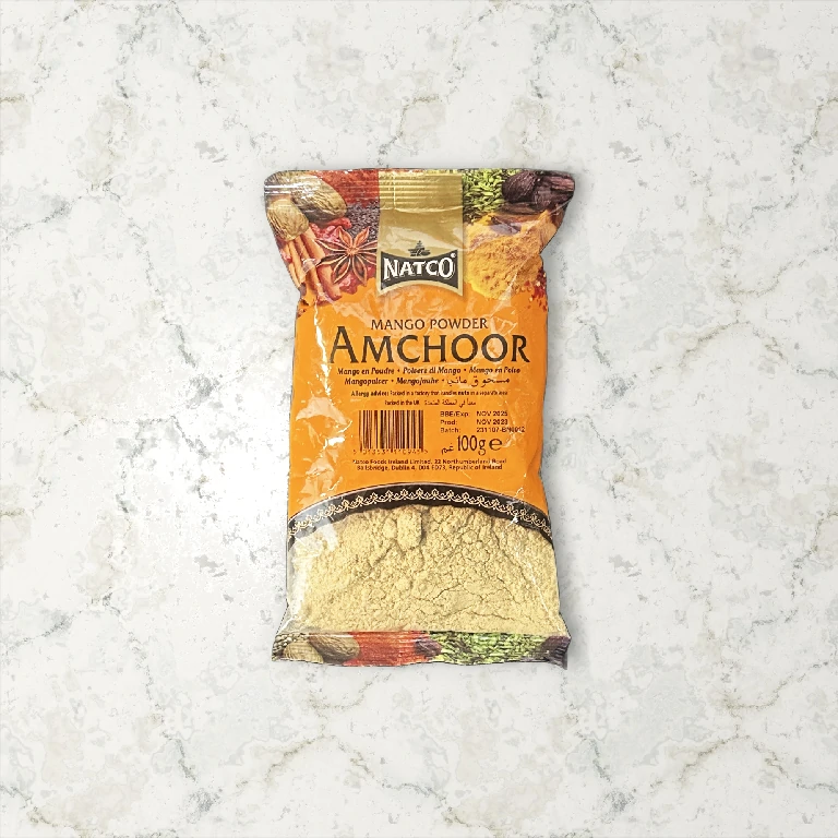 Amchoor, or mango powder, is made by drying unripe green mangoes and grinding them into a fine powder. Its tangy and slightly fruity flavor makes it a popular ingredient for adding acidity and brightness to dishes without using liquid forms like lemon juice or vinegar.